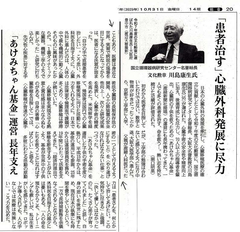 | 産経新聞 2025年10月31日 朝刊掲載 川島 康生 氏 (中学23回) 令和7年度 文化勲章を受章された川島先生の記事が掲載されました。 (PDFファイルをリンク設定してますので画面クリックでご覧ください) |