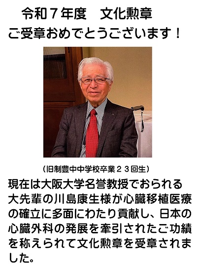 | 令和6年 秋の叙勲で ・髙9期 後 洋一 氏 (元公立高等学校長)が 「瑞宝小綬章」 を受章されました 豊中高等学校卒業後のご経歴: 大阪学芸大学英語科卒業。中学校、高等学校教諭、 大阪府科学教育センター(現大阪府教育センター)指導主事、 大阪府立千里高等学校教頭、大阪府立枚方高等学校長等を経て、 現同志社女子大学特任教授、平安女学院大学講師 |